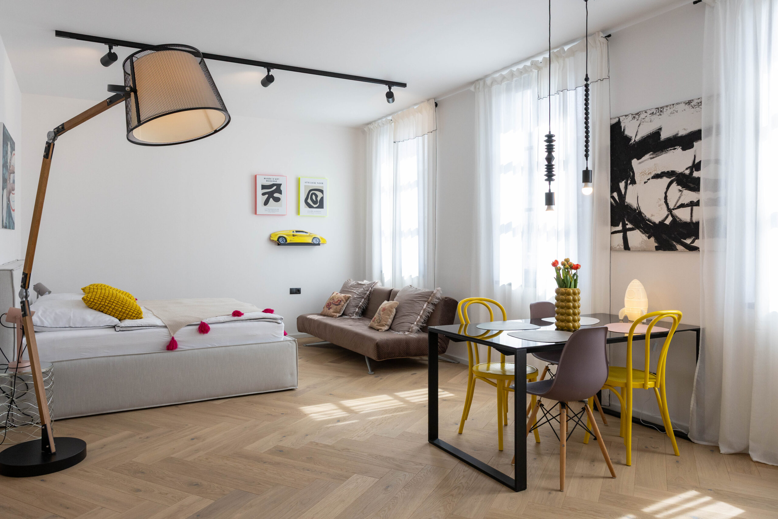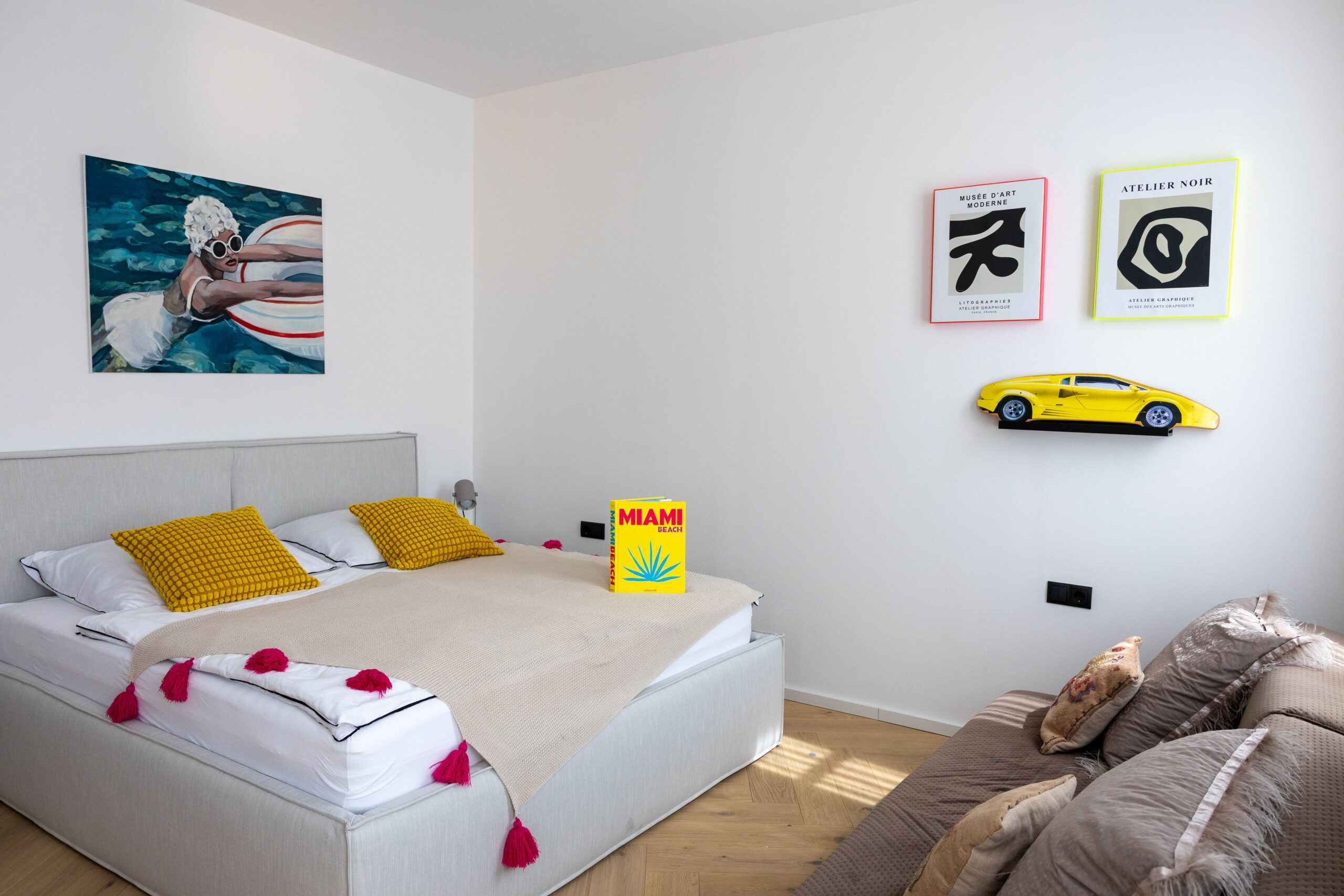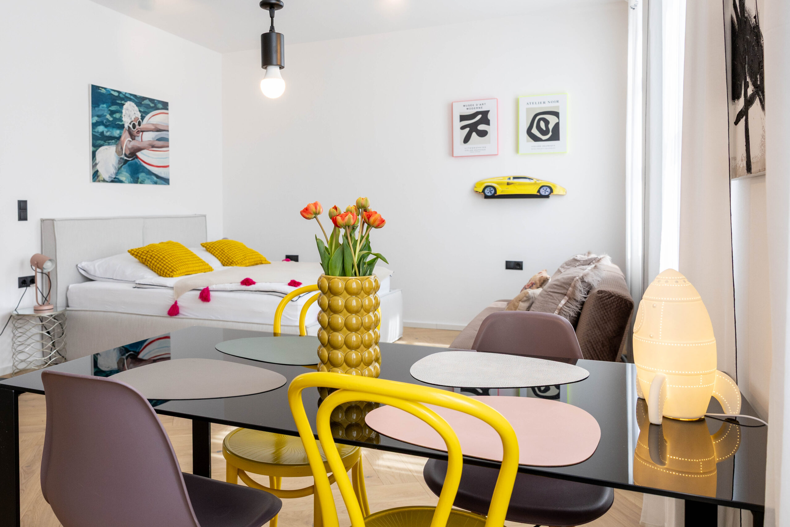Zimmer Miami bringt Farbe ins Weinviertel! Mit mutigen Kombinationen, geometrischen Mustern und einem Hauch Art-Déco spiegelt es die Energie einer modernen Metropole wieder. Trotzdem bleibt der Raum gemütlich und stilvoll – mit viel Liebe zum Detail.